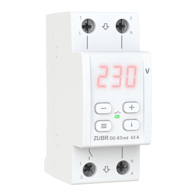 Защитное реле напряжения однофазное D2-63 на DIN-рейку, 63А, 13900ВА, 120-280В, двухмодульное с индикатором напряжения (Красный)