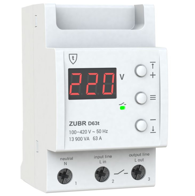 Защитное реле напряжения однофазное D63t c термозащитой на DIN-рейку, 63А, 13900ВА, 120-280В, трехмодульное с индикатором напряжения (Красный)