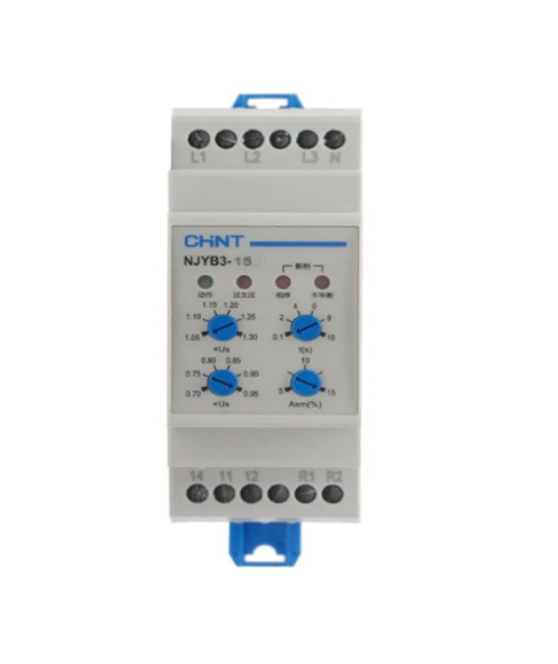 Реле контроля фаз CHINT NJYB3-15 AC220V, 3F4P, Защита U+ (1~1,3) *Us/U- (0,7~0,95) *Us, Задержка 0,1~10с, 1CO+1NO